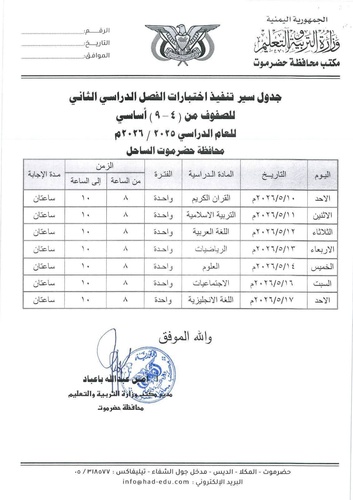 تربية ساحل حضرموت تُقر جدول اختبارات الفصل الدراسي الثاني