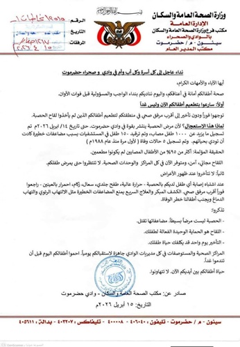وأوضح البيان أن مرض الحصبة يشهد انتشارًا متسارعًا في عدد من مناطق وادي حضرموت، حيث تم تسجيل مئات الحالات، بينها حالات استدعت الترقيد في المستشفيات، إلى جانب تسجيل وفيات، في مؤشر مقلق يستدعي رفع مستوى الوعي المجتمعي والتحرك العاجل للحد من تفشي المرض.