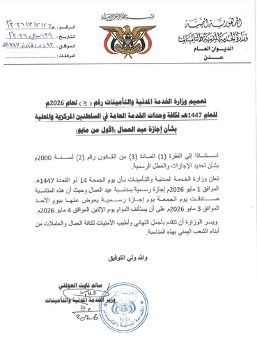 أصدرت وزارة الخدمة المدنية والتأمينات تعميمًا رسميًا قضى باعتبار يوم الجمعة الموافق الأول من مايو 2026م إجازة رسمية بمناسبة عيد العمال، لكافة وحدات الخدمة العامة في السلطتين المركزية والمحلية.